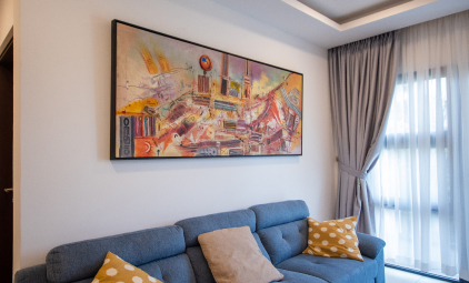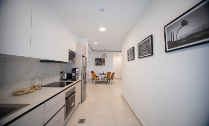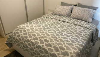The one-bedroom apartment is a comfortable place to live, ideal for maximum two people. It has a large living room, a kitchen with modern appliances, and a cozy bedroom with plenty of closet space. The bathroom is clean and well-designed. The apartment complex offers amenities like a fitness center, parking, and shared spaces that are kept clean. It is in a convenient location, close to reputable schools, shops, restaurants, and public transport.